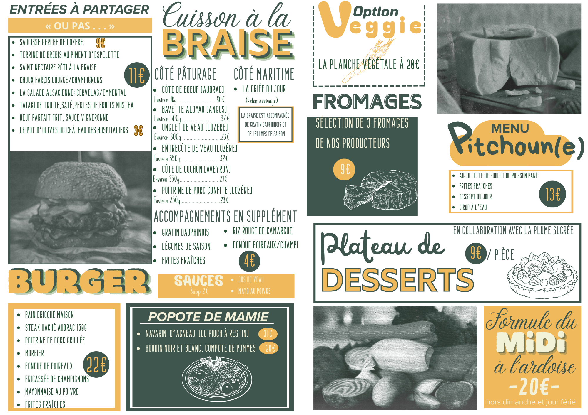 La carte du restaurant est renouvellée toutes les 5 semaines. Les suggestions journalières complètent cette Cuisine d’Humeur, locale, de saison, frais et fait Maison.